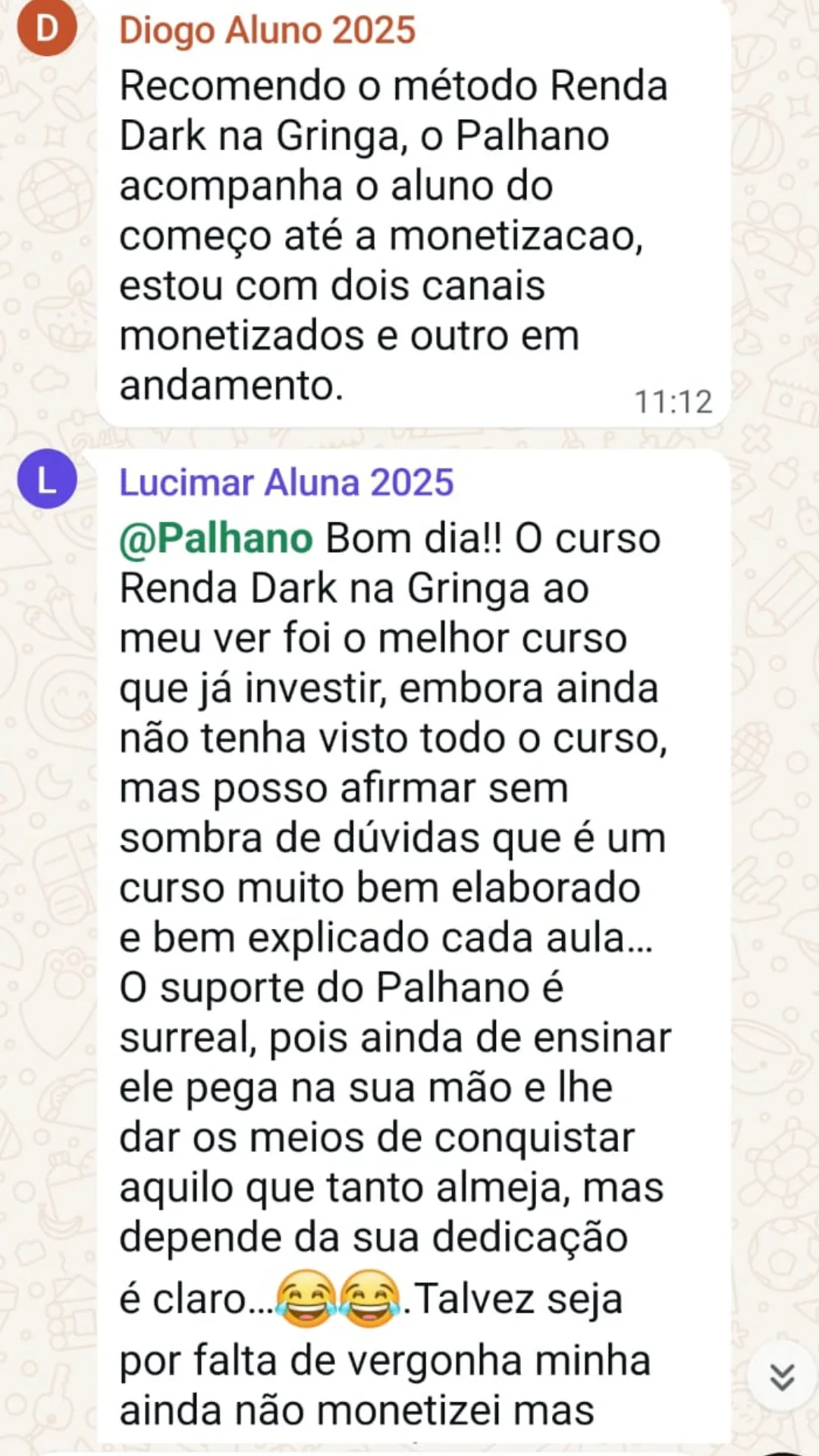 Nosso método é direto ao ponto: o Renda Dark na Gringa vai ensinar os nichos mais lucrativos para você começar a monetizar em tempo recorde. Temos vários alunos que começam a monetizar em 22 dias, 30 dias e, no máximo, 40 dias, faturando em dólar.