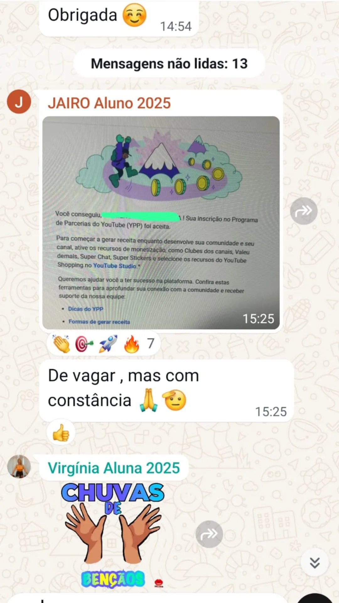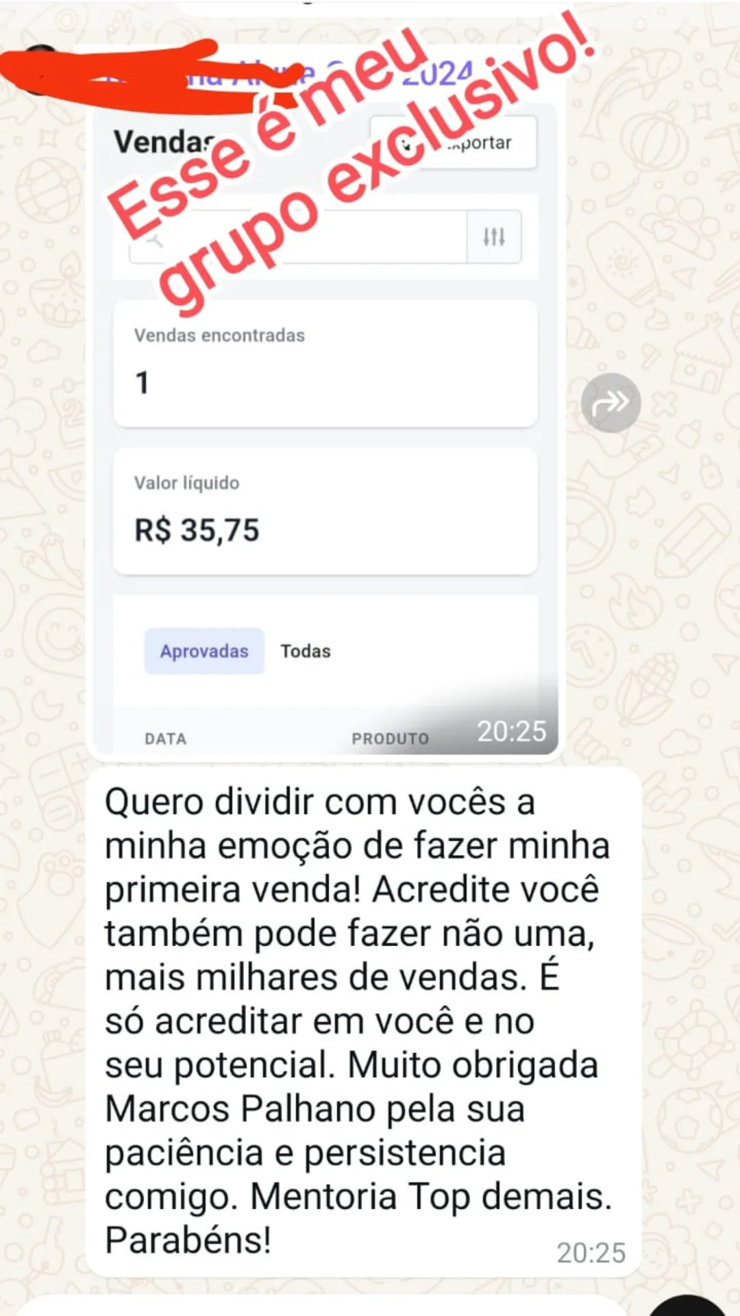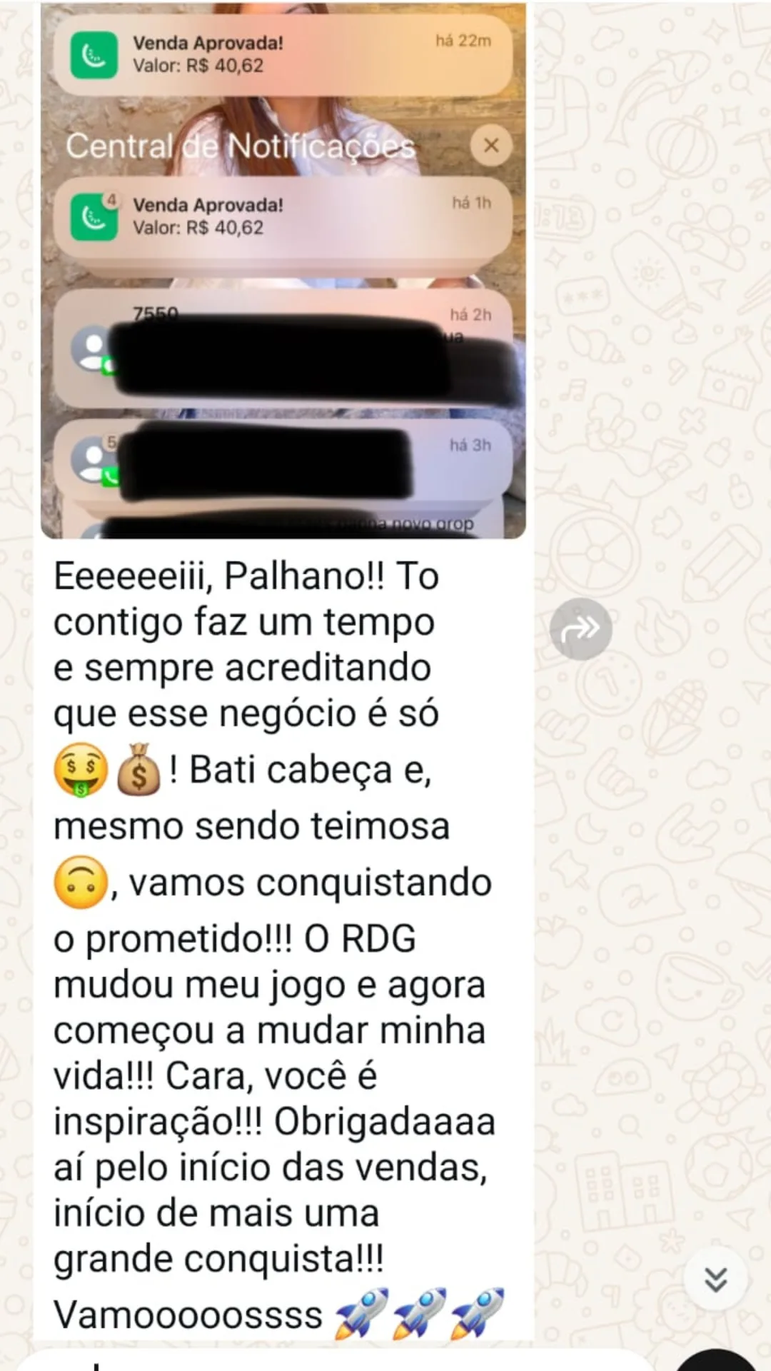 Toda semana tem mentoria ao vivo no WhatsApp. Você tira dúvidas, recebe orientação e acelera seus resultados com suporte real de quem vive disso.
