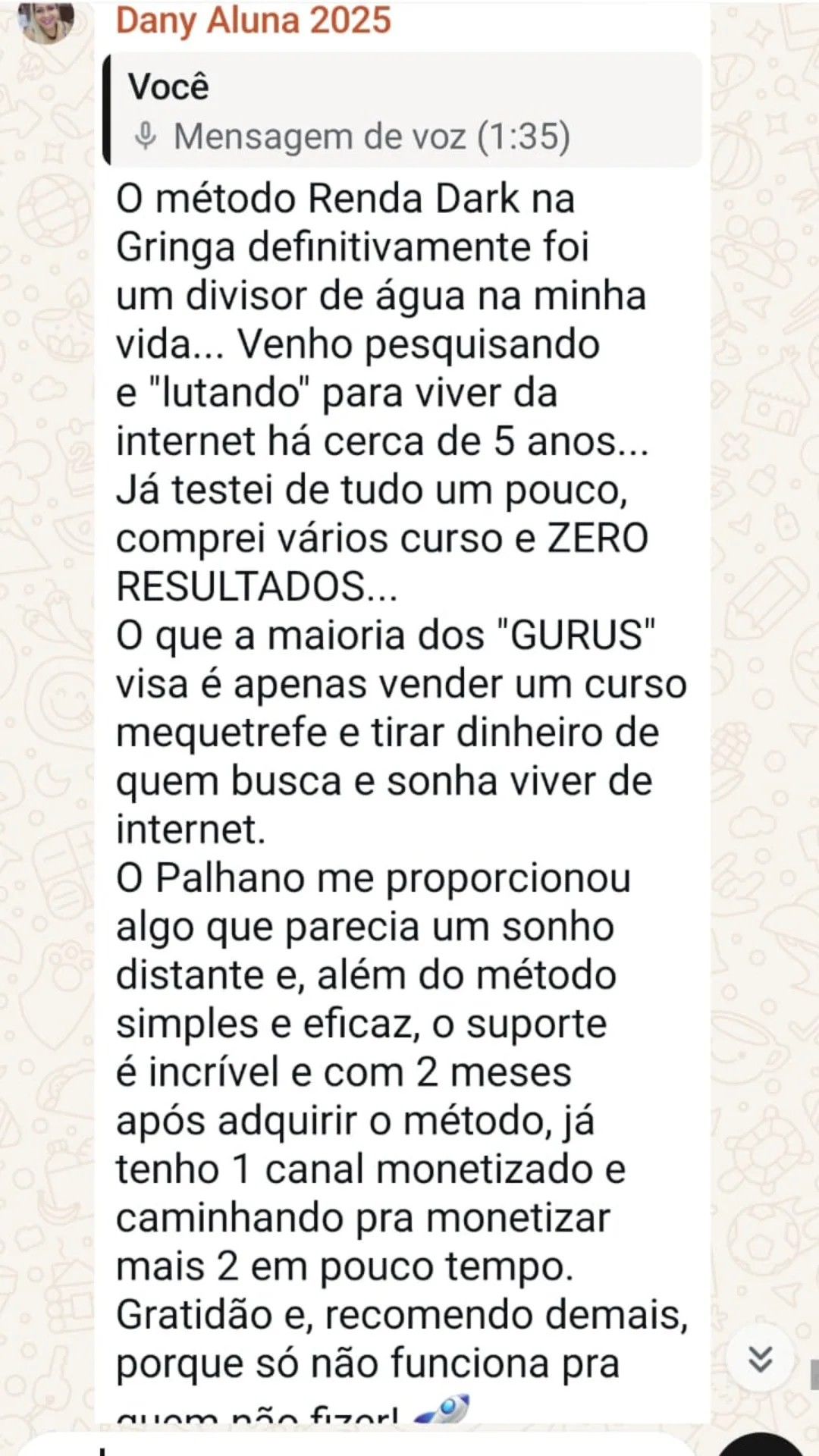 Se você está cansado de promessas vazias e quer um passo a passo simples, aplicável e com suporte real, o Método Renda Dark na Gringa foi feito pra você — mesmo que nunca tenha criado um canal.